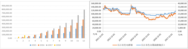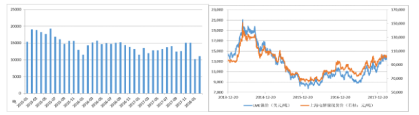 (电解镍月度产量变化图) ( LME期价于上海电解镍现货价走势图对比)