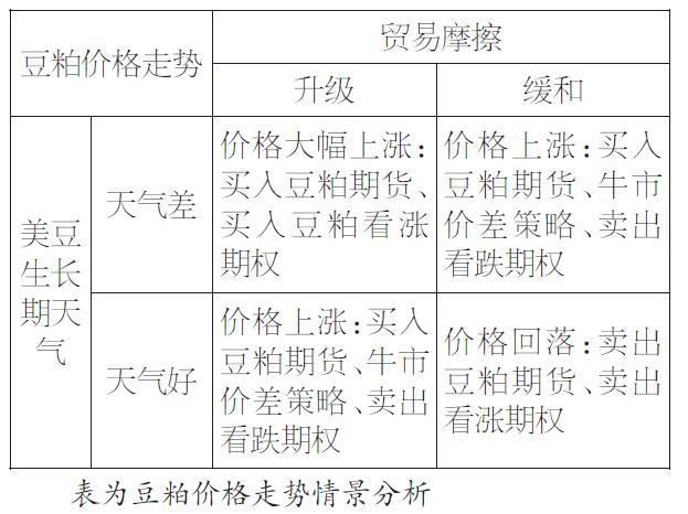 目前,南美大豆产量基本确定,市场焦点主要集中在中美贸易摩擦和美国大豆生长期天气上。豆粕价格偏高,溢价体现了市场对中美贸易摩擦的担忧。我们可以对两个不确定因素进行情景分析。情景一即是贸易摩擦升级且美国天气出现问题,这种情况下,豆粕价格将大幅上涨,可以运用期货或者期权工具予以应对,做多豆粕期货或者购买豆粕看涨期权。情景二贸易摩擦缓和但美国天气走坏,情景三贸易摩擦升级但美国天气未出大问题,这两类情景下,豆粕价格也将迎来上涨行情,但涨幅不会有情景一那么大。此时,可以做多期货或者运用期权构造牛市价差或者卖出看跌期权予以应对。至于情景四,贸易摩擦缓和,美国天气表现良好,豆粕价格将回调,可以卖出看涨期权或者做空豆粕期货,预计这种情况出现的概率不大,因为市场有在美豆播种和生长期炒作天气的习惯。