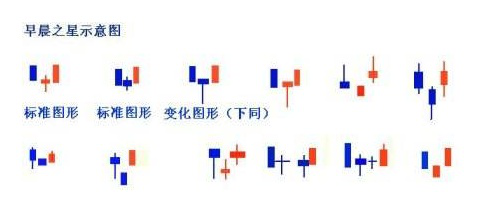 该组合是看涨K线组合分析中最常见的组合形态,一般出现在行情的底部也叫做希望之星。在期价下跌的过程中出现一根阴线,次k线跳空低开以小阳线或者小阴线报价,第三k线以阳线报收,期价在开盘后从底部一直上升到阴线的内部形成早晨之星形态,示意见下图。