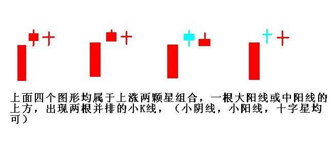该形态由3根K线组成,第一根为大阳线或者中阳线。第二根和第三根为小K线或者十字线,也可能是小阳线或者小阴线,并且这两根小线的实体位于阳线的实体之上。