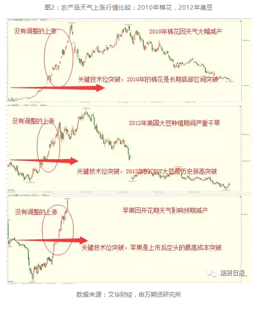 截至目前的行情,苹果和2010年的棉花和2012年的美豆11月的走势非常的类似,都是因为天气原因引发行情,进而突破关键的技术阻力,之后展开了一波凌厉的上涨行情。