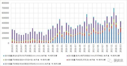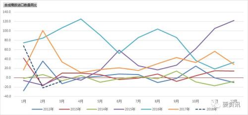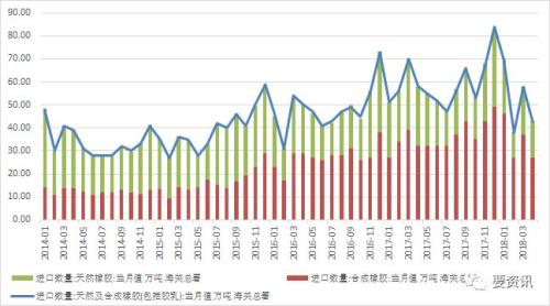 合成胶方面,三月份进口量为37万吨,同比下跌6.8%,四月份进口27万吨,同比下跌15.6%。