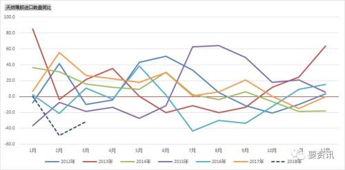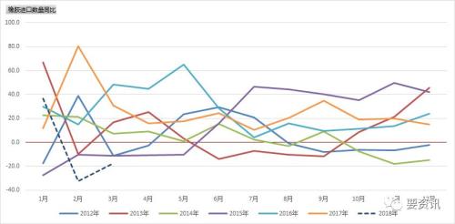 3月份天然橡胶进口同比下降31.6%,4月份天胶进口量同比下降38.4%。