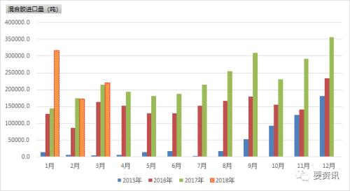 为进口合成胶的主要种类,混合胶进口量也出现了增速下滑的趋势,3月份混合胶进口数量为21.99万吨,同比微增2.8%。