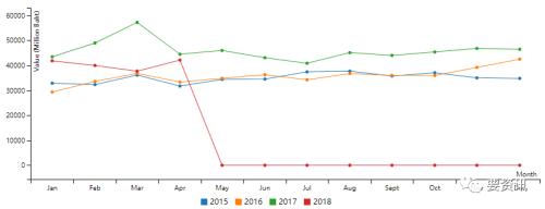 2015-2018泰国出口橡胶金额(百万铼)