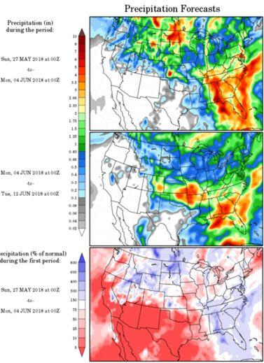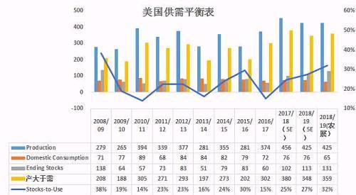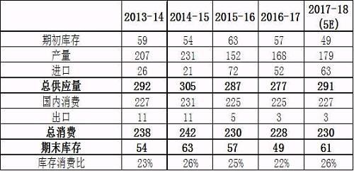 根据USDA5月全球产需预测,2017/18年度美国产量455.5万吨,较上月调低2.4万吨;出口量337.5万吨,调增10.9万吨;期末库存102.3万吨,调减13.1万吨。