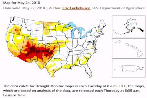 近日得州西部出现了大范围降雨,但仍没有改变当地极度干旱的状态,天气预报显示,拉伯克地区高温将持续至下周,降水概率很小。关注后期降水情况。