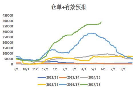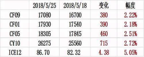 截至2018年5月25日,郑棉期货市场仓单共计8324张,有效预报1440张,仓单加有效预报折合棉花总量达39万吨,为近5年同期最大值,有79%的仓单加有效预报在内地仓库。