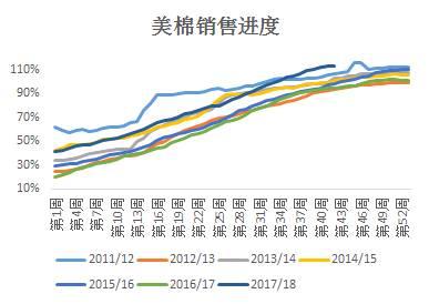 截至5月17日当周,美国2017/18年度棉花净出口销售量累计达到382万吨,完成USDA出口预测(5月)的113%,高于五年均值10个百分点;美棉装运量累计达到261万吨,装运率77%,低于5年均值3个百分点。