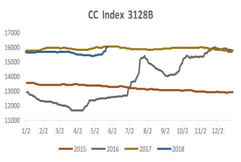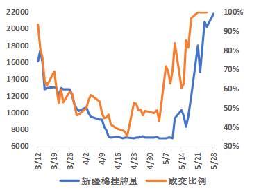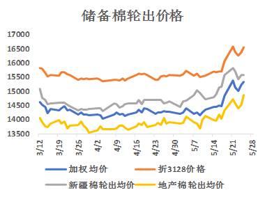截至5月25日,17/18年储备棉轮出挂牌量共159万吨,累计成交97万吨,其中新疆棉成交55万吨,地产棉 成交42万吨,累计成交率61.23%,预计18年国储成交率相对低点4月或已现。5月28日-6月1日当周标准级储备棉轮出底价为15283(+343)元/吨。