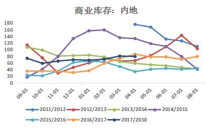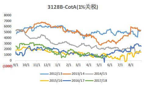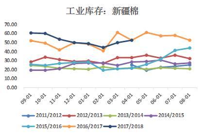 我们考虑18/19年国储继续轮出150万吨,则国储新疆棉库存不足以支撑18/19年轮出, 18/19年度期末国储还剩余140万吨,市场流通的棉花相对17/18年度在减少,期末库存也达到了近4年的最小值,基本面明显转好。