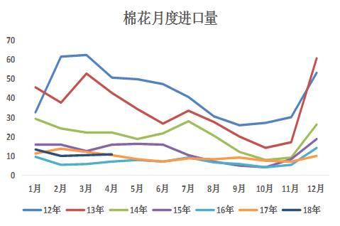 2018年4月中国进口皮棉11万吨,17/18年度前8个月累计进口棉花80万吨。