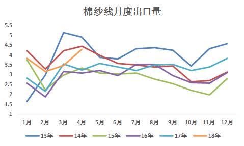 2018年4月,我国出口棉纱4.29万吨,环比增23.6%,同比增32%。