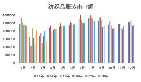 2018年4月,我国出口纺织品服装约214.9亿美元,同比下滑0.6%,环比提高34%。其中出口纺织纱线、织物及制品105.1亿美元,同比提高7.1%,环比提高33.6%;出口服装及衣着附件109.7亿美元,同比下滑7%,环比提高34.5%。