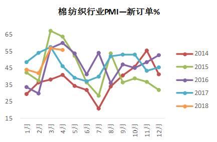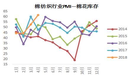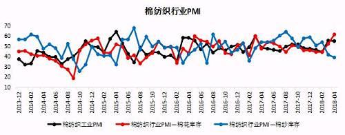 2018 年 4月,中国棉纺织行业采购经理人指数(PMI)为 55.13%,环比减少0.28 个百分点,同比增加6.3个百分点,在50% 枯荣线以上。除了棉花库存指数环比有所增加外,其余指数均有所下降。