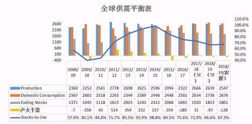18/19年度首次预估平衡表数据中,对下年度全球单产悲观,预计棉花产量略减,消费量大幅增加,全球期末库存同比减少6%。