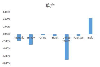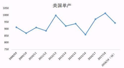 2018/19年度美棉预计收获面积调增0.27%至11130千英亩(4504千公顷),单产调减7%至943公斤/公顷,产量调减31万吨。