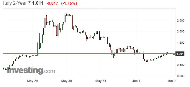 意大利债市也止住了“跌跌不休”的脚步。10年期意大利国债收益率日内跌逾20个基点,最低触及2.50%一线,本周初期曾站上3%;波动幅度更大的两年期意债收益率最低跌至0.66%,周二曾触及2.841%的2013年以来最高。意大利五年期CDS下跌23个基点至210个基点。