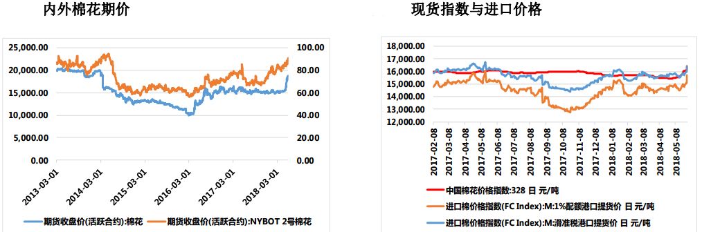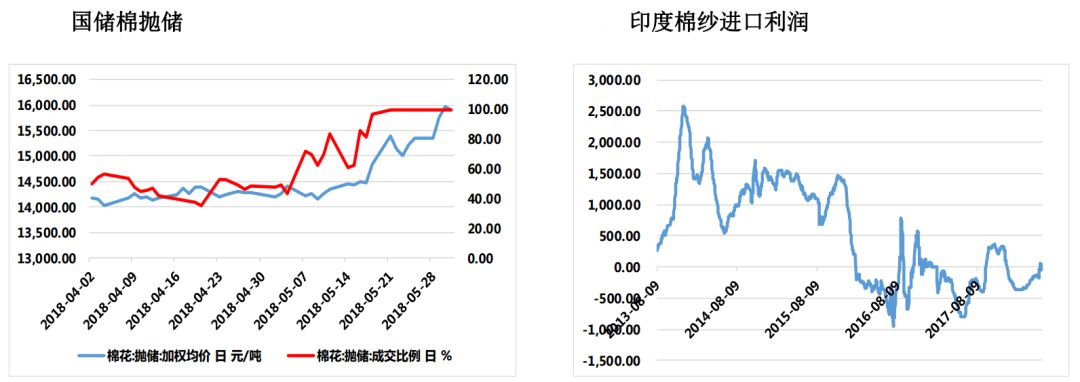 外棉方面,美国德州东部和北部继续高温干旱,印度截至5月中旬时北部地区播种延迟。虽然目前尚不能就今年新棉的产量做出准确预测,但天气因素的不确定性给市场以炒作理由。一般地,中国、美国、印度等地棉花多在10月份开始大规模采摘,8、9月份天气因素对棉花最终产量的影响比较明显。所以,到那个时候天气炒作才算高一段落。此外,美国是中国进口棉的主要来源国,中美贸易摩擦给棉价走势也带来冲击。若中国提高美棉进口关税,则无疑增加进口成本。即使不针对美棉加税,中国的采购需求也可能增加,相应也可能推高进口价格。所以,美棉坚挺也是刺激郑棉走强的重要因素。
