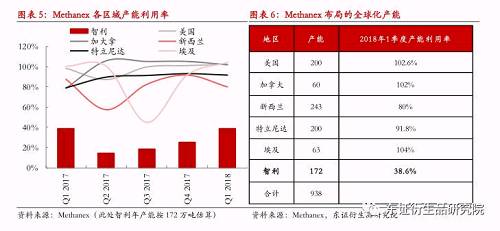 Methanex在2011-2016年间的装置重启、迁移以及扩能等动作已是不断,高利润趋动之下企业积极寻求办法进一步提高产能利用率。Methanex位于美国、加拿大、新西兰与特立尼达的装置基本可以实现高负荷运行,埃及地区装置受限于天然气原料负荷会有波动,今年企业则将重点解决长期饱受缺气困扰的智利装置问题。智利的两套装置长期受缺气困扰,企业通过积极解决气源问题,预计闲置的Chile IV装置(84万吨/年)将于2018年3季度末实现重启,从而促使智利装置的整体开工负荷从低位提升到中等水平。