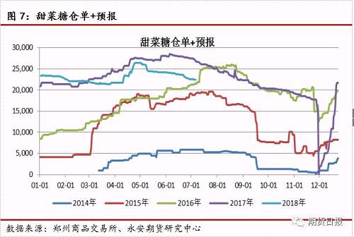 尽管今年盘面长期贴水广西和云南现货,但是盘面转为甜菜糖定价,甜菜糖仓单压力仍在。总的仓单和预报合计约40万吨,初步统计甜菜糖约为22万吨,另有中粮5万吨信用仓单,不确定食糖品牌。近期甜菜糖仓单有所流出,但总体量仍较大,盘面承压。