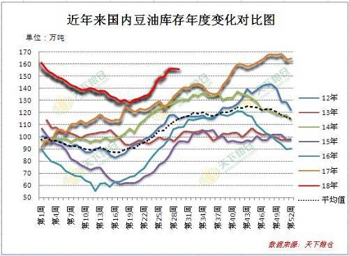 不过另一方面,近来国内豆油供应仍然较为充裕,而终端需求不旺,导致豆油库存居于历史相对高位,据Cofeed数据显示,截止7月20日当周,国内豆油商业库存总量达156万吨,虽说较前一周同期降幅为0.15%,但较上个月同期增幅近11%,较去年同期的134.5万吨增幅逾16%。
