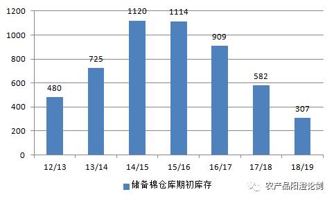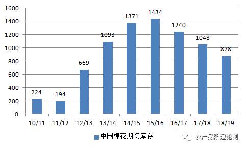 其次,需要关注的是中国的棉花库存问题。2018/19年度注定是中国棉花市场走入转折的关键一年,2011年10月至2013年3月的储备棉收储后,中国开始进入漫长的去库存周期,连续五年棉花期初库存超过1000万吨,2018/19年度的棉花库存终于降至878万吨,逐年下降的库存对棉花市场是值得额手称庆的事情,但是2018/19年度几乎处处充满了变数。