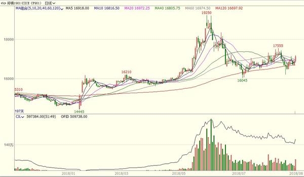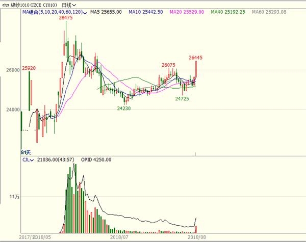 昨日棉纱主力合约1810开盘十五分钟后封涨停,日成交量21036手,持仓量增2450手至4250手,郑棉量能具增收高1.72%,重新站回万七线上,近期国外棉花走势以震荡调整为主,国际宏观环境对棉花市场影响显著,前期市场消化土耳其里拉大幅贬值以及USDA报告上调美棉产量的利空影响,后期美棉主产地西德州干旱天气缓解令市场再度承压。郑棉以及棉纱近日走高主因是国内需求回升,储备棉轮出成交量大幅走高,纺织企业补库意愿增强,纱厂开机率连续三周回升,坯布库存下降趋势明显,另一方面,近期PTA大涨使棉纱替代品涤纶短纤、粘胶价格坚挺,下游纱线企业被动上调现货价格,棉纱受现货价格带动,多头资金流入期价突破26000点重要关口。
