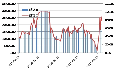 上周开始,储备棉轮出成交低价大幅下调,储备棉轮出量触底反弹,第二十五周,储备棉轮出底价为15692元/吨,较上周下调47元/吨,8月27日储备棉成交2.93万吨,成交率97.57%,一方面成交价下调调动买家积极性,另一方面,下游需求回暖提振棉价。