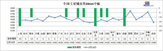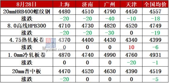 8月28日,国内钢材市场小幅下跌,唐山普方坯含税出厂价下跌10至4050元/吨。进入8月下旬,螺纹钢、热卷期货主力合约呈现窄幅调整,投资者及终端用户恐高情绪升温,钢材现货市场成交量下滑,厂商选择小幅让利出货。