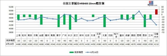 建筑钢材:8月28日,全国25个主要城市HRB400(20mm)螺纹钢均价4557元/吨,较上一交易日价格下跌18元/吨。期螺低位反弹后,市场交投气氛稍显活跃,个别地区低价资源回归主流,全天成交随环比上一交易日有所好转,但并未达到市场预期,全天价格依旧收跌。从目前情况来看,终端采购谨慎,成交量持续性不佳,价格弱势震荡态势运行,而且区域间价差有所修复,表现为高价区域跌幅较大,低价区域窄幅震荡。综上来看,短期国内建筑钢材价格将仍呈震荡态势偏弱运行。