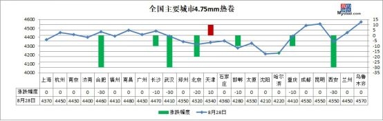 热轧板卷:8月28日,全国24个市场4.75mm热轧板卷价格报4399元/吨,较上一交易日价格下跌6元/吨。从市场库存角度看,整体库存处于低位,这对于市场价格支撑起到一定作用。从钢厂角度看,华北钢厂整体出厂价在4240-4290元/吨,钢厂压力不大,对后市也并不乐观。从三地价格看,华北地区市价在4280-4320元/吨,华东市价在4370-4400元/吨,华南地区市价在4410-4450元/吨,虽然期盘在处于震荡,但市场可调整空间确并不明显,商家手中货少的继续顶价,货多的则小幅抛售,但整体维持能卖高则卖高的原则。目前看,钢厂产量或将在下周,下周检修又有继续增加,短期市场供应量相对维持低位。就后期看,钢厂库存不出现大幅下降的情况下,价格可调整空间也并不明显。