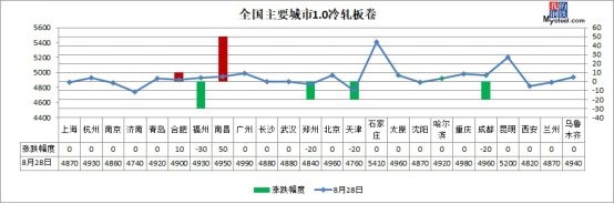 冷轧板卷:8月28日,全国24个主要城市1.0mm冷轧板卷均价为4931元/吨,较上一交易价格下跌1元/吨。昨日早盘成交氛围偏淡,多数地区现货价格表现以稳为主。但随着午后黑色商品期货逐渐走强,市场成交渐好。据商家反馈,近期价格虽然维持坚挺走势,但成交多表现不畅,因此存在暗降情况。但由于目前订货成本价过高,贸易商也不愿过多降价出售,因此预计今日冷轧现货价格震荡趋稳运行。