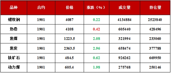 昨日国内黑色系商品宽幅震荡,除热卷盘面有小幅度回升外,整体趋弱,持仓量上增减互现,其中期螺1901合约增仓最为明显。昨日RB1901合约宽幅震荡。受周末沙钢继续上调出厂价格,以及唐山出台新的限产方案影响,商家心态有所加强,不过当前市场反应平平,现货价格涨跌互现。技术面上,期价止跌企稳,在4050处支撑较强,整体仍站立于40日均线之上。操作上建议在4050附近可以考虑多单介入,止损参考4000。
