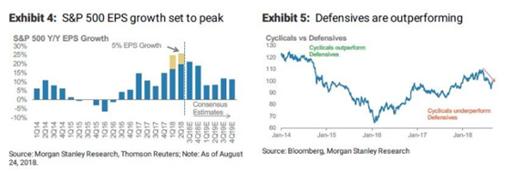 摩根士丹利两个月前将科技行业调降为“卖出”,该行策略师去年还预测美股有强劲回报,而对今年的回报则抱持更谨慎的态度,部分是源于担心正处于高峰期的每股收益增长在今年二季度到顶,并将于三季度开始下滑(下图表4),以及最近的防守板块表现逐渐强势(表5)。