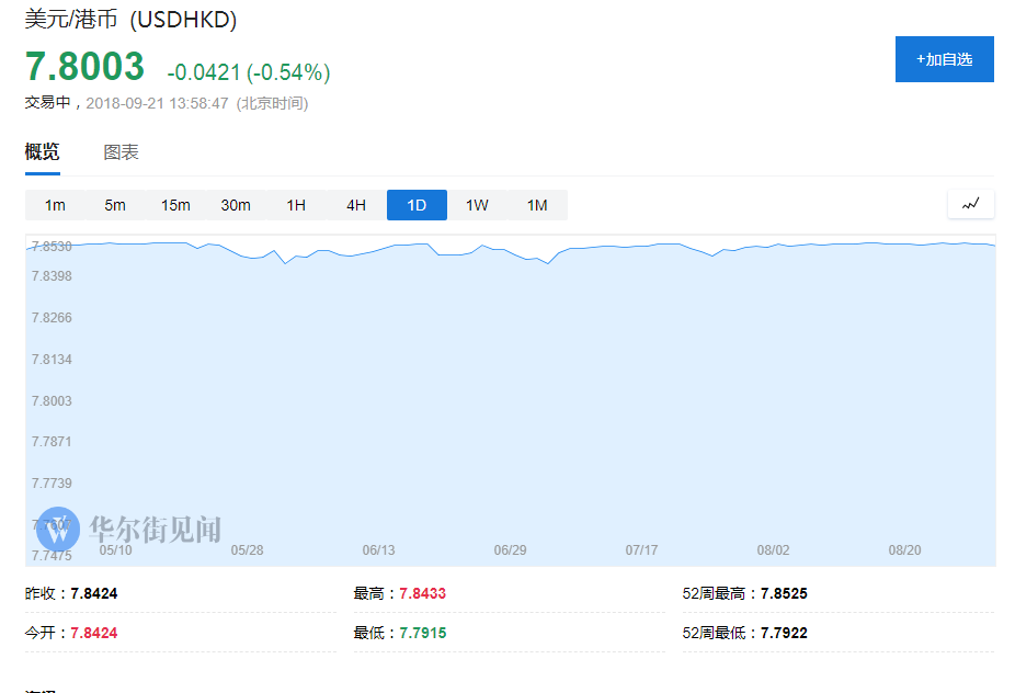 北京时间9月21日午后,港元兑美元涨幅不断扩大,现涨0.5%,日内涨逾400点,创下2003年来最大涨幅,涨破7.80的强弱兑换保证中位数,重回去年11月高点。