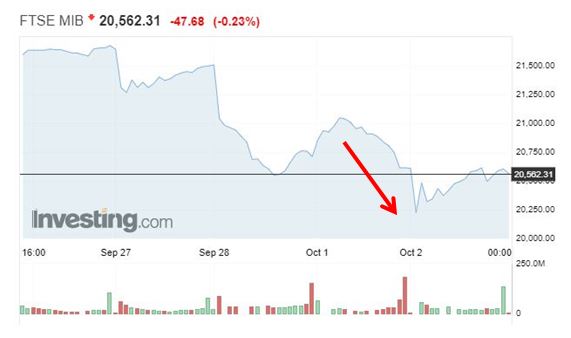 10月2日,因预算赤字问题和下议院预算委员会主席发布疑欧言论影响,意大利连续两日遭遇股债双杀,拖累德法英等欧洲股市全线低开。