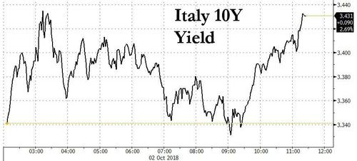 10年期意债收益率在周二美股时段一度涨幅收窄,但美股午盘重新扩大涨势,日内最高涨14个基点至3.44%,重新测试5月29日所创的2014年3月以来最高水平,意债收益率曲线也进一步趋平。