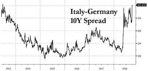 衡量市场避险情绪的10年期意债/德债收益率息差涨17个基点,冲破300个基点,为今年以来第二次突破这一整数位。