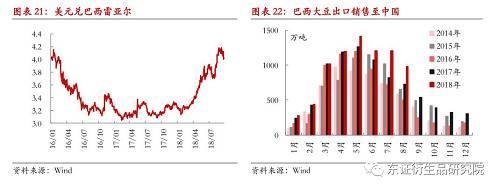 另外,由于巴西雷亚尔的持续贬值,导致巴西农民纷纷加快了大豆的销售力度。美国农业部预计2017/18年度巴西大豆出口量将增至7670万吨的新高,较2016/17年度的纪录增加1300余万吨,同时预计2018/19年度的巴西大豆出口量也有7500万吨之高,出口销量的大幅攀升也导致巴西大豆结转库存较2016/17年度显著下滑。