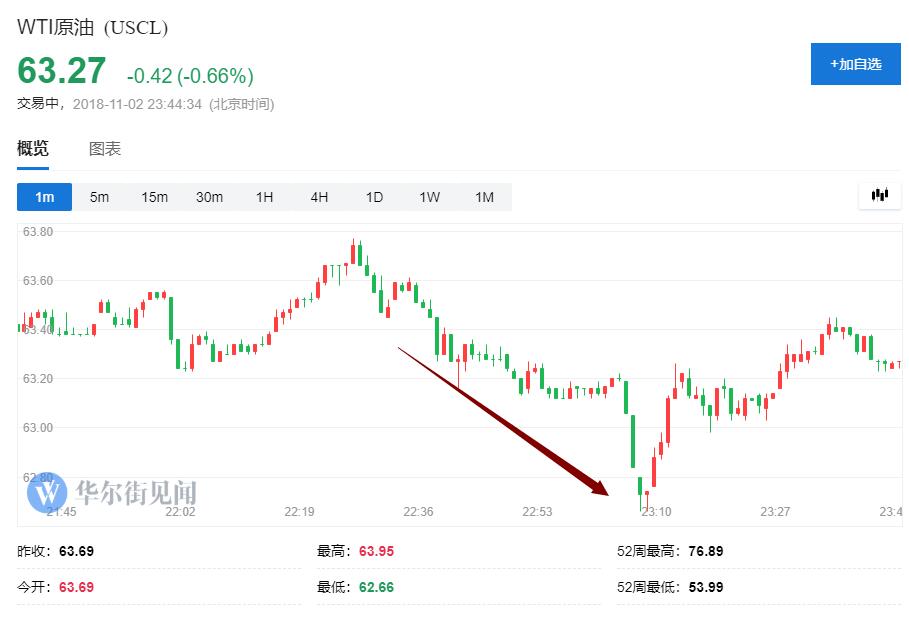 在布油创两个多月新低的同时,WTI跌幅一度超过1.5%,刷新今年4月前期以来低点至62.66美元/桶,截至最近一次更新,重上63美元,日内跌幅收窄到0.7%以内。