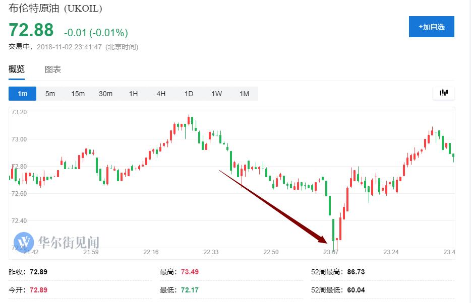 美国高官确认制裁生效及豁免一些国家后,国际油价震荡下行,跌幅扩大,23点07分左右,布伦特原油期货一度刷新8月21日以来低点至72.17美元/桶、日内跌幅接近1%,截至最近一次更新,接近抹平所有跌幅。