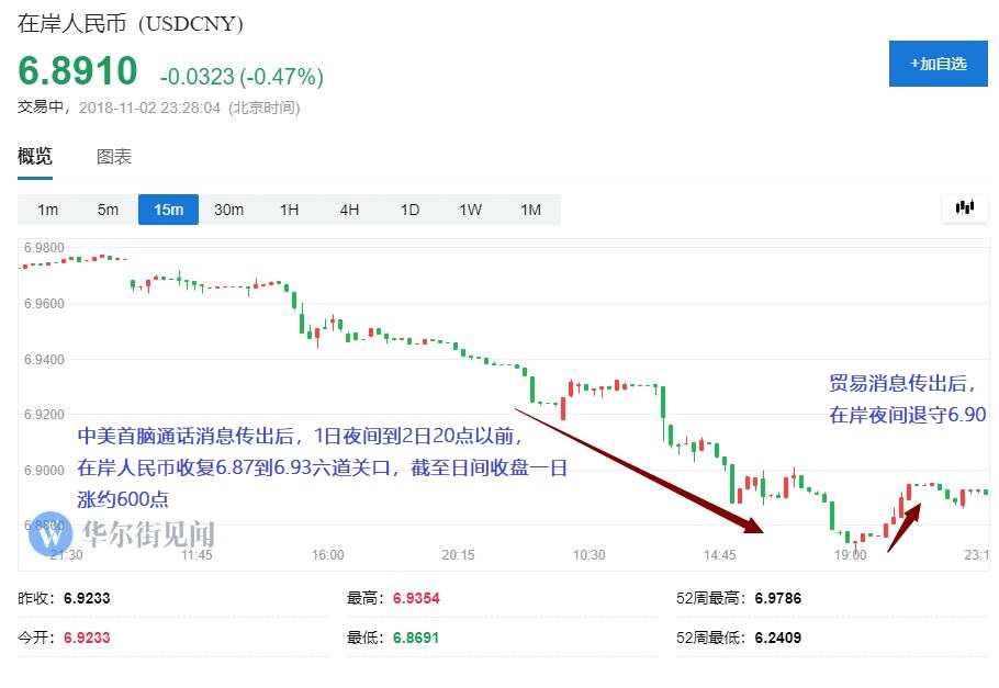在此之前,自11月1日夜间新华社等媒体确认中美领导人通话的消息后,离岸人民币接连收复从6.86到6.93七道关口,仅在2日19点以前的一小时内就收复了6.86到6.88三道关口。