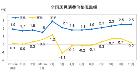 中国10月CPI同比2.5%,与预期值和前值持平,居民消费价格同比涨幅也保持在过去8个月来的高位。