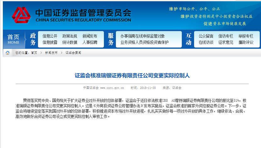 中国证监会11月30日晚间公布,于近日依法核准UBS AG增持瑞银证券有限责任公司的股比至51%,核准瑞银证券有限责任公司变更实际控制人。