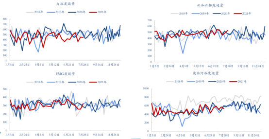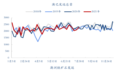 本周铁矿石发运量低位有所回升,澳巴发运总量为2273.3万吨,环比增加185.8万吨,同比减少52万吨。其中澳洲发运量为1602.3万吨,环比增加144.4万吨,同比减少52.1万吨。澳洲发中国量1389.4万吨,环比增加140.1万吨,同比减少32.1万吨。巴西发运量为671万吨,环比增加41.4万吨,同比增加0.1万吨。