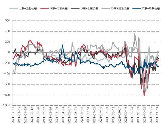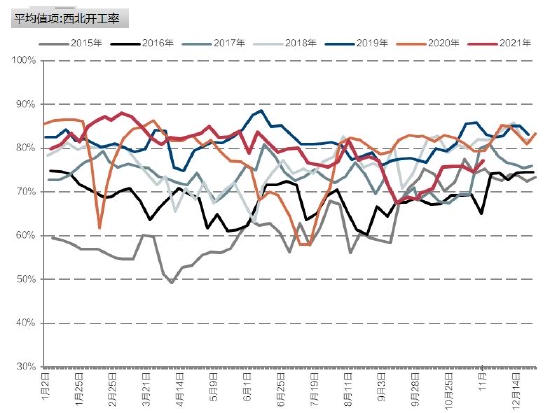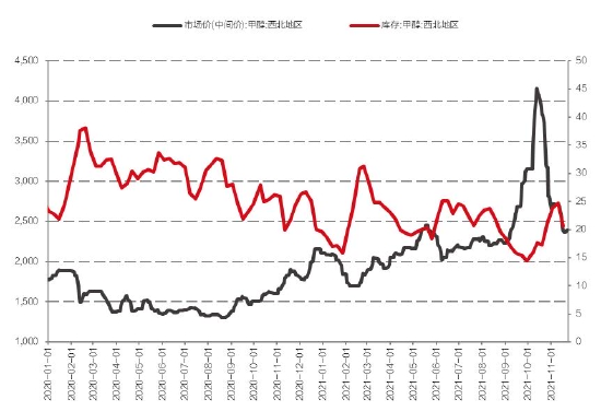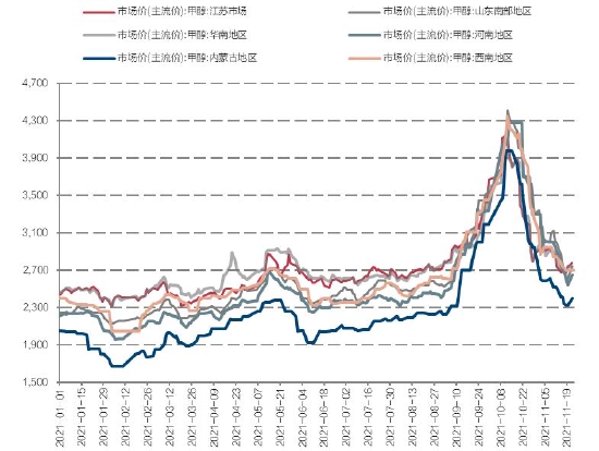 1-8月全国甲醇装置高负荷运行,开工维持在70%-76%区间运行,处于近五年来高位上沿。从煤炭价格对甲醇的传导来看,由于煤制甲醇占到国内甲醇产能的超7成,煤炭是国内甲醇生产的最主要原料,区别于国外甲醇90%以上来自于天然气,煤炭价格是影响我国甲醇生产成本的最主要因素。1-10月国内煤炭价格大幅上涨,秦皇岛5500动力煤现货最高接近2600元/吨左右,鄂尔多斯坑口价格也一度超过1500元/吨。产区煤制甲醇自5月起现金流击穿成本线,至年底仍处于亏损状态,装置检修逐渐增多。同时部分主产区还受到能耗双控政策的影响,内蒙古、陕西、宁夏等地陆续有展开能耗双控举措。煤炭紧缺、煤价高企、煤制甲醇利润下滑影响有所显现,国内供应部分收缩。截止11月底全国甲醇装置开工负荷在65%左右,西北地区的开工负荷在77%左右。