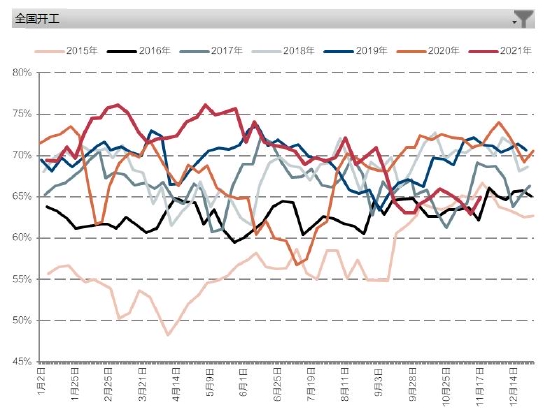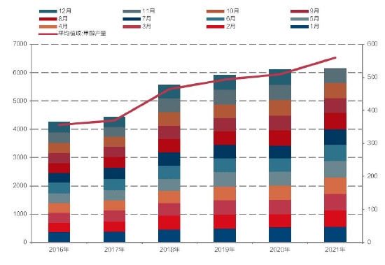 2021年甲醇装置开工率延续高位水平,年总产量接近6900万吨,全国平均开工率约七成,月均产量560万吨左右,较2020年涨幅9.7%。
