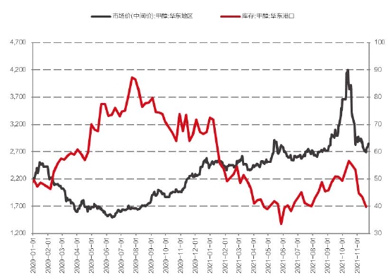2021年甲醇价格整体呈现冲高回落走势。1-10月甲醇价格重心不断上移,并于10月中旬创下甲醇期货上市以来最高价格,期货主力合约最高行至4235元/吨。10月中旬煤炭受政策严控价格迅速下跌,甲醇跟随煤化工板块迅速回落,11月价格逐渐企稳,至年底维持震荡修复走势。