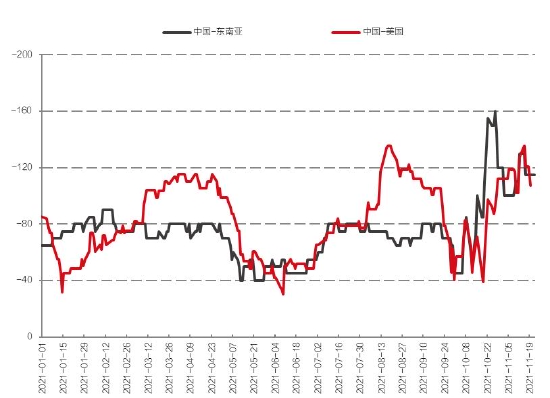 国际甲醇生产装置以天然气为主要原料,2021年国际天然气价格大幅上涨,1-10月价格重心不断抬升,10月一度突破6美元/MMBtu左右。四季度略有回调,11月底回落至5美元/MMBtu,仍处于近年来高位水平。天然气作为国际甲醇生产的主要原料,一方面抬升国际甲醇生产成本,国际甲醇进口成本上行至超过1900元/吨,较年初涨幅44%。另一方面也由于原料紧缺造成装置停车增多,国际甲醇供应短缺,全球价格积极上涨。
